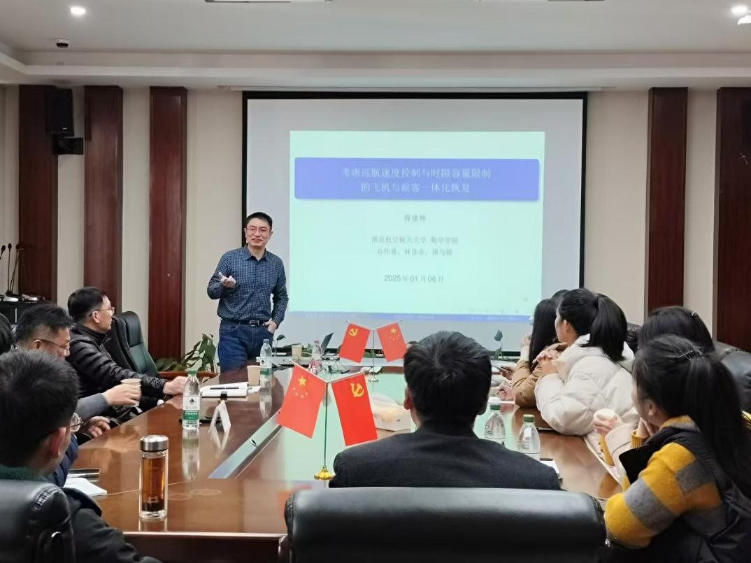 1月6日上午,beat365举行数海领航大讲堂2025年第5期。本期邀请南京航空航天大学蒋建林教授为全院师生带来一场题为“考虑巡航速度控制与时隙容量限制的飞机与旅客一体化恢复”的学术讲座。讲座由副院长郑松教授主持,部分教师及研究生参加了此次讲座。