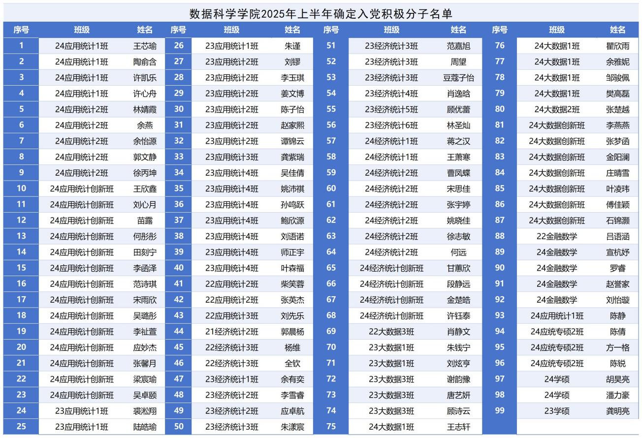 根据党组织考察、团支部推优等情况,各党支部委员会于2025年4月7日讨论研究,确定吸收王芯瑜等99位同学为入党积极分子。